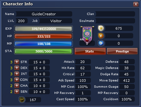 Stats are a way to customize your character and build. Stat Points are obtained each time your character levels up, you can use them to increase your Stat attributes. Stat attributes are limited to 450 per basic stat. The cost of increasing an attribute varies from 3 to 80 points.