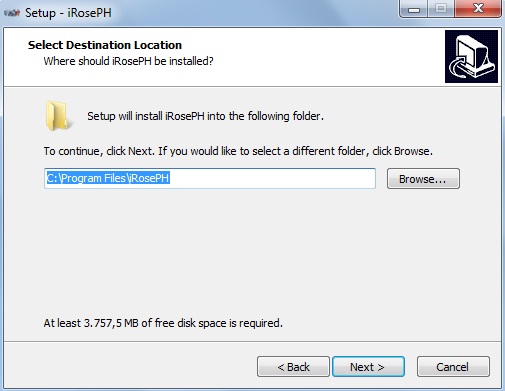Select the drive and folder where you want to have your iRosePH files installed. Just click on continue if you want it installed on the default folder, or click on browse button if you want it installed on a different location on your hard drive.