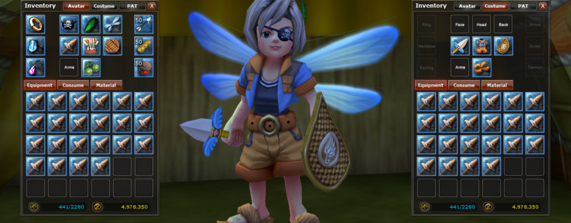 With the Avatar window you can put on your battle armor, masks, weapons, shields, back items, jewelry and ammunition (arrows, bullets and shells).