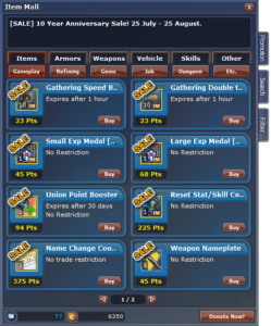 Donation items that are no longer needed can be disassembled by an item disassembler such as [Ferrell Guild Staff] Kiroth in City of Junon Polis. 50% of the item’s current price will be rewarded back to your Item Mall window as Credit points.